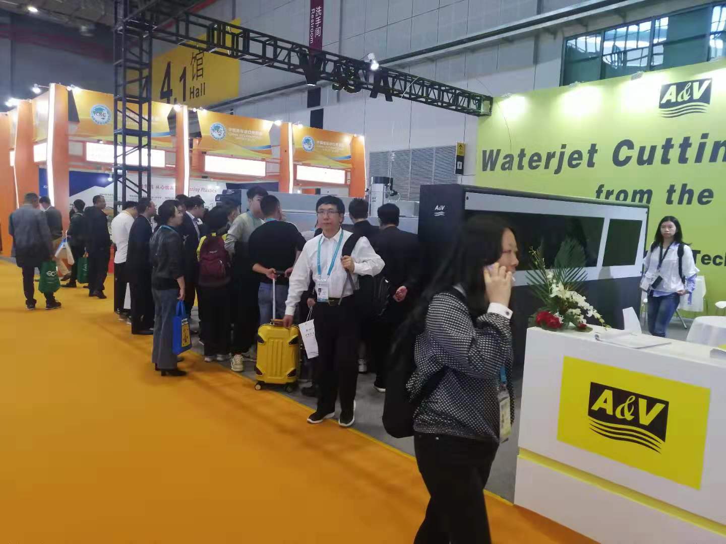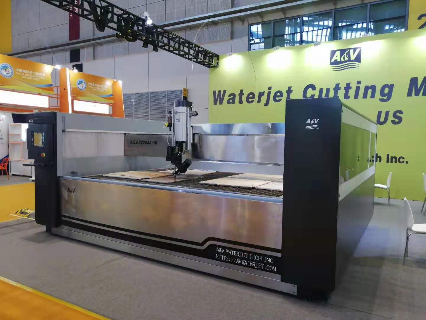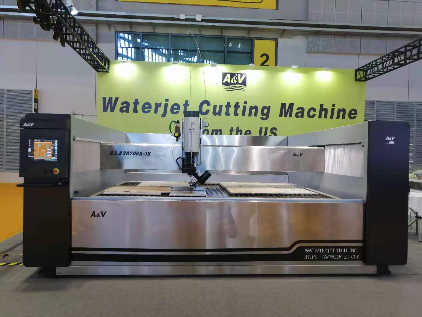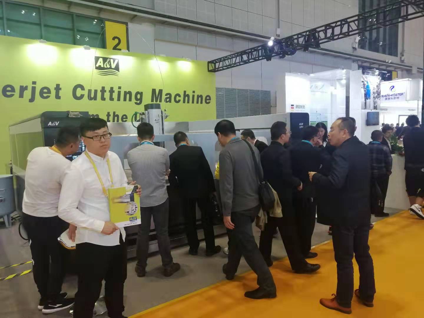 展會現場上,愛迪威(A&V)公司參展的“龍門式定心AC五軸水切割平臺”,以卓越的性能,實用、美觀的外型贏得青睞。