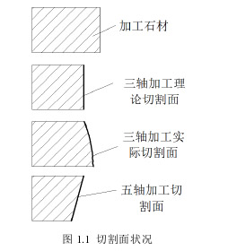 在中國制造 2025 的大環(huán)境下,為了快速促進(jìn)制造業(yè)產(chǎn)業(yè)化升級,朝著“互聯(lián)網(wǎng)+”的發(fā)展趨勢,將信息化和工業(yè)化進(jìn)行融合,把重點(diǎn)放在開發(fā)新一代科技信息技術(shù)產(chǎn)業(yè),如高檔數(shù)控機(jī)床、機(jī)器人結(jié)構(gòu)機(jī)床、航空航天制造業(yè)、先進(jìn)軌道交通和電力裝備、新型材料、生物醫(yī)療器械裝備及農(nóng)業(yè)器械裝備等[1]。參與制定泉州制造 2025 規(guī)劃及市級“燎原計(jì)劃”重大關(guān)鍵技術(shù)解決方案有工業(yè)機(jī)器人控制器開發(fā)及產(chǎn)業(yè)化,高性能交流伺服驅(qū)動及電機(jī)的研制與跨行業(yè)示范應(yīng)用以及國產(chǎn)數(shù)控技術(shù)在熱熔膠器涂布復(fù)合機(jī)的應(yīng)用、節(jié)能伺服系統(tǒng)在制鞋業(yè)行業(yè)的應(yīng)用、衛(wèi)生用品多軸同步張力控制系統(tǒng)的研制與應(yīng)用、高精度柔性折彎機(jī)專用數(shù)控系統(tǒng)研發(fā)與推廣應(yīng)用、高性能數(shù)控激光設(shè)備的研發(fā)與推廣應(yīng)用、石材專用數(shù)控設(shè)備的研發(fā)與實(shí)踐應(yīng)用推廣等國產(chǎn)數(shù)控系統(tǒng)產(chǎn)品開發(fā)與示范應(yīng)用。數(shù)字化、網(wǎng)絡(luò)化及智能化是傳統(tǒng)制造業(yè)進(jìn)行轉(zhuǎn)型升級的主要考慮方向,也是制造業(yè)未來發(fā)展的一個必然趨勢[2]。從“數(shù)代”到“智能一代”,泉州華中科技大學(xué)智能制造研究院作為泉州市政府培養(yǎng)的重點(diǎn)企業(yè),也將努力為實(shí)施“中國制造2025”強(qiáng)國戰(zhàn)略做出應(yīng)有的貢獻(xiàn)。 近年來,隨著“超高壓數(shù)控水切割機(jī)床”技術(shù)的不斷更新和完善,數(shù)控水切割機(jī)床在市場上已逐漸推廣和應(yīng)用。水切割是利用水(純水或是加磨料的水)噴射的動能對工件進(jìn)行加工,它可以對反光型材料、復(fù)合型材料、化學(xué)纖維、熱敏感型材料及玻璃陶瓷等材料進(jìn)行加工;水刀切割相比于激光切割、電火花切割等切割方式有以下一些優(yōu)點(diǎn):是一種冷態(tài)切割,切割面沒有熱變形;水切割在加工過程中沒有發(fā)生材料的化學(xué)變化,即不影響切割材料物理性質(zhì);切割工件表面清潔且環(huán)保等[3]。對于三軸的水切割數(shù)控系統(tǒng),由于能量梯度和水的聚焦發(fā)散作用,切面越深時(距噴嘴越遠(yuǎn)時),水切割能力就會越差,所切割出的切割面與工件表面經(jīng)常就會不垂直,切割面如圖1.1 所示,雖然可以通過提高水的能量或是降低水切割的速度可以減低部分不垂直度,但是大部分水刀切割石材產(chǎn)品都用于石材水刀拼花(即石材工件與石材工件鑲嵌的過程,不同顏色或不同形狀也可以都相同的石材工件),這就需要切割面有一定的傾斜度,以更好的鑲嵌,使邊緣的拼縫小且美觀大方。這些都是三軸水切割數(shù)控系統(tǒng)機(jī)床無法完成的。為了解決切割不垂直度的問題,五軸聯(lián)動的水切割數(shù)控機(jī)床概念就被提了出來,它的基本原理是:在原有三個直線軸 X、Y、Z 的基礎(chǔ)上再加兩個擺動軸 A、B 或 A、C 或 B、C,來實(shí)現(xiàn)水刀刀頭向任意方向的擺動,并用 RTCP(Realtime Transport Control Protocol)技術(shù),將控制點(diǎn)定在刀具的中心點(diǎn),通過實(shí)時刀具長度補(bǔ)償確保刀具的中心點(diǎn)沿著指定的路徑移動[4]。從而使水切割產(chǎn)品達(dá)到無斜度切面或形成指定角度的切面。