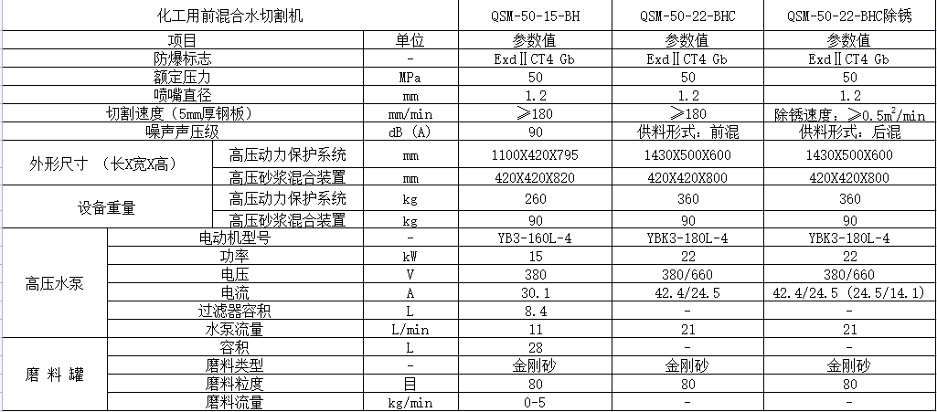 QSM-50-15-BH型化工用前混合水切割機(jī),適用于化工儲(chǔ)罐、石化管道、圓柱類金屬的切割和化工廠拆除維修、打孔切口、清洗除銹等。是在化工企業(yè)易燃易爆環(huán)境實(shí)施切割作業(yè)的安全設(shè)備。本機(jī)型可切割厚度0.1- 100mm的任何材質(zhì)(金剛石及特種硬質(zhì)合金除外)。