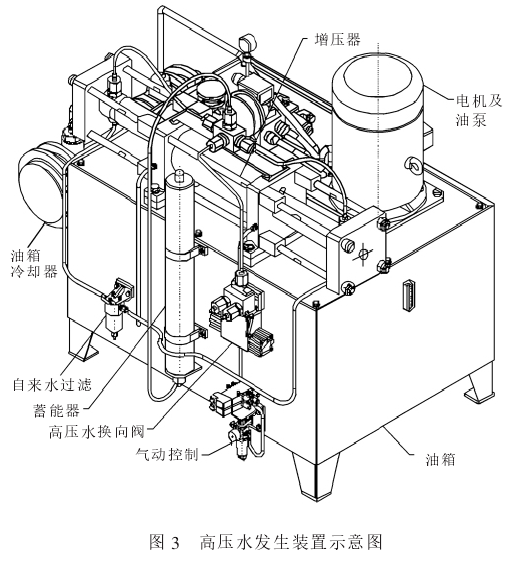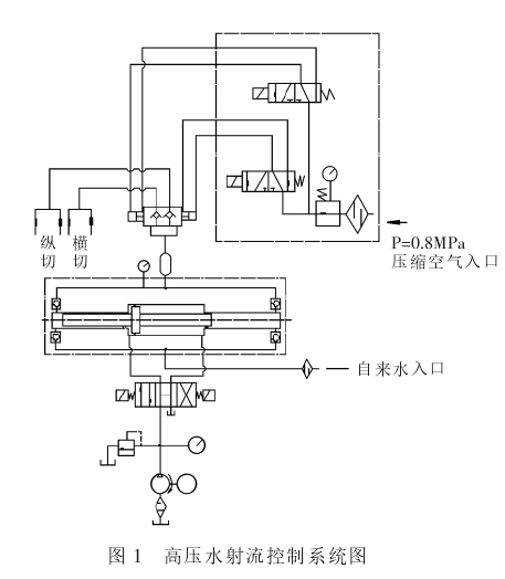高壓水射流控制系統(tǒng)流程為:油泵加壓、電磁換向閥、高壓水增壓器、高壓蓄能器、高壓水換向閥、高壓水噴嘴、板材切割。