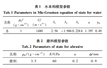水采用 SPH算法建模,在 LS-DYNA中用 NULL材料模型,并對(duì)水材料模型賦予 Mie-Grueisen狀態(tài)方程;磨料粒子為陶粒,采用 lagrange有限元建模,并用剛體材料模型,直徑均為 0.9mm(對(duì)應(yīng)20目)。建模過(guò)程中為盡可能接近實(shí)際工況,建立密集的 SPH水粒子束,將磨料粒子分布于水粒子中;為防止水粒子對(duì)磨料粒子初始穿透,將每顆磨料粒子位置的SPH水粒子逐一刪除,以“挖”出磨料粒子的存在空間。水與磨料模型參數(shù)分別見(jiàn)表 1、表 2,其中 ρ0為材料密度;E為彈性模量;υ為泊松比;?為直徑。Mie-Grueisen狀態(tài)方程為