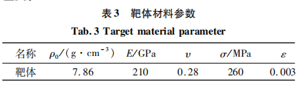靶體為鋼材料采用 lagrange有限元建模,選用PLASTIC_KINEMATIC材料模型,該材料模型按照單元的應(yīng)變值是否超過(guò)材料失效應(yīng)變值確定是否刪除單元,可在一定程度上模擬靶體受磨料水射流作用后沖蝕孔的發(fā)展過(guò)程。材料參數(shù)見(jiàn)表 3,其中 ρ0 為材料密度;E為彈性模量;υ為泊松比;σ為失效應(yīng)力;ε為失效應(yīng)變。