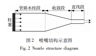 將前混合磨料水射流形成過(guò)程考慮為柱塞以一定速度作用于水,使水以一定流量向前運(yùn)動(dòng),帶動(dòng)事先隨機(jī)分布于水中的磨料,通過(guò)收縮噴嘴形成高速磨料水射流。噴嘴、柱塞均采用 lagrange有限元建模,采用剛體材料模型,其結(jié)構(gòu)示意圖見(jiàn)圖 2。