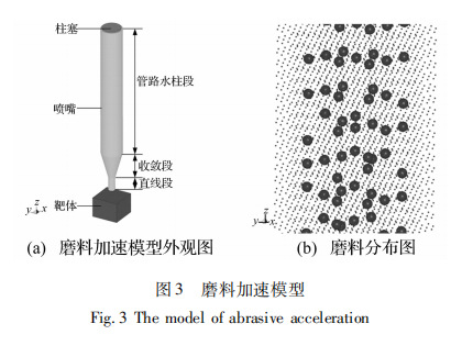 據(jù)以上建模方法建立幾何模型見(jiàn)圖 3。圖 3(b)為(a)中管路水柱段內(nèi)部水粒子與磨料粒子分布。限制柱塞自由度,使其只在 Z方向移動(dòng),柱塞直徑 14mm,厚度 1mm;限制噴嘴在各方向移動(dòng),其中管路水柱段直徑 14mm,長(zhǎng)度 100mm,噴嘴收斂段長(zhǎng)度 20mm,噴嘴直線段直徑 3mm,長(zhǎng)度 10mm;靶體為 20mm×20mm×15mm長(zhǎng)方體,對(duì)底面、外圍 4面采用 NON_RE-FLECTING非反射約束模擬無(wú)限邊界,同時(shí)約束地面節(jié)點(diǎn)在各自由度的位移。水模型含 13700個(gè) SPH粒子,72個(gè)磨料粒子,共計(jì) 18432個(gè)六面體單元;噴嘴模型含 3380個(gè)六面體單元;柱塞模型含 384個(gè)六面體單元;靶體模型含 6000個(gè)六面體單元。