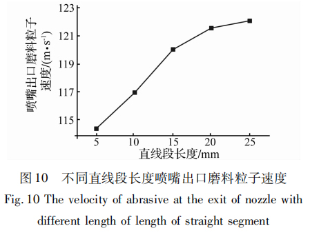 流量一定即74L/min,噴嘴進(jìn)出口直徑一定即14mm、3mm,噴嘴收斂段長(zhǎng)度 20mm情況下,改變直線段長(zhǎng)度,選4顆磨料粒子獲得噴嘴出口(直線段末端)平均速度,見(jiàn)圖10。由于收斂段中磨料粒子已與水存在速度差,且直線段中水仍有加速,故直線段加長(zhǎng)會(huì)致磨料粒子加速空間更長(zhǎng)。由圖10看出,隨直線段加長(zhǎng)磨料粒子在噴嘴出口速度增大,但隨直線段長(zhǎng)度逐漸增大,磨料粒子速度增加幅度逐漸變小,直線段長(zhǎng)度由5mm到15mm,速度增加較大,平均每增加5mm速度增大2.75m/s;直線段長(zhǎng)度由15mm到20mm,速度增大1.5m/s;直線段長(zhǎng)度由20mm到25mm,速度增大0.5m/s。直線段長(zhǎng)度變化 20mm速度增加7.5m/s,增加幅度較收斂段有所增大,但當(dāng)磨料粒子速度增加到與水流速度接近后,其速度增長(zhǎng)幅度隨直線段延長(zhǎng)變小,且在實(shí)際應(yīng)用中直線段過(guò)長(zhǎng)會(huì)使水與磨料粒子的沿程阻力增大導(dǎo)致能耗增加,故在滿足工況設(shè)計(jì)前提下,可適當(dāng)延長(zhǎng)噴嘴直線段長(zhǎng)度,但不能過(guò)多延長(zhǎng)。