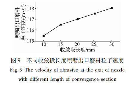 按本文模擬方法,在流量一定即 74L/min,噴嘴進(jìn)出口直徑一定即14mm、3mm,噴嘴直線段長(zhǎng)度10mm下改變收斂段長(zhǎng)度,選4顆磨料粒子獲得噴嘴出口(直線段末端)平均速度,見(jiàn)圖9。由圖 9看出,噴嘴收斂段加長(zhǎng)下由于流量一定,噴嘴進(jìn)出口速度一定,水流經(jīng)噴嘴收斂段的平均速度變小,由此可以推斷水流經(jīng)收斂段加速度變小,從而對(duì)磨料的加速較弱,但收斂段加長(zhǎng)會(huì)延長(zhǎng)磨料粒子的加速歷程,使其有相對(duì)充裕的加速時(shí)間。隨收斂段加長(zhǎng),磨料粒子速度呈增大趨勢(shì),收斂段長(zhǎng)度由10mm增加到15mm,速度增加1m/s;收斂段長(zhǎng)度由15mm到30mm每增加5mm,速度增加0.5m/s。由此,收斂段長(zhǎng)度變化20mm 速度增加 2.5m/s,增加效果有限。