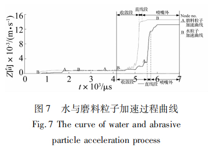 由于數(shù)值模擬中建立的磨料粒子非單獨(dú)一顆,在磨料粒子的加速過(guò)程中涉及到磨料粒子間碰撞,為盡可能獲得完整加速過(guò)程,在磨料粒子群即將進(jìn)入噴嘴收斂段時(shí)提取其前端靠近噴嘴軸心線的一顆磨料粒子,選水介質(zhì)部分中與提取的磨料粒子處于 Z軸方向同一斷面上一顆 SPH水粒子,繪制噴嘴軸線上速度 -時(shí)間曲線,分別按磨料粒子、水粒子運(yùn)動(dòng)歷程將噴嘴不同階段標(biāo)注于速度 -時(shí)間曲線上,見(jiàn)圖 7。由圖 7看出,磨料粒子進(jìn)入噴嘴收斂段前已基本達(dá)到與水相同的運(yùn)動(dòng)速度,進(jìn)入收斂段后在流量一定情況下,由于過(guò)流斷面積變小,水流速度急劇增大使磨料粒子與水之間存在速度滑移,該速度差的存在使磨料粒子獲得加速,但由于磨料粒子質(zhì)量大,慣性大,故磨料粒子提速相對(duì)緩慢,導(dǎo)致在收斂段中其與水速度差逐漸增大;進(jìn)入直線段后,由于收斂段積聚的壓能部分釋放,水流速度繼續(xù)增大,但增量有限并在直線段末端趨于穩(wěn)定,磨料粒子由于在收斂段導(dǎo)致速度滯后較大,使其在進(jìn)入直線段后與水存在巨大速度差,直線段過(guò)流斷面較小,使磨料粒子在直線段劇烈加速,并隨時(shí)間延續(xù)逐漸趨向水流的速度;在離開(kāi)噴嘴后的短距離范圍內(nèi),不考慮噴嘴外空氣阻力情況,水流有小幅度速度增加并迅速穩(wěn)定,主要因水介質(zhì)在噴嘴中由于瞬間高壓存在微量的體積壓縮,離開(kāi)噴嘴后能量釋放導(dǎo)致速度微量增加,而磨料粒子在噴嘴外核心段射流的繼續(xù)作用下仍有速度增加,但最終因磨料粒子運(yùn)動(dòng)逐漸脫離核心段射流部分導(dǎo)致速度趨于穩(wěn)定。數(shù)值模擬結(jié)果與文獻(xiàn)[15,23-27]研究成果吻合較好。