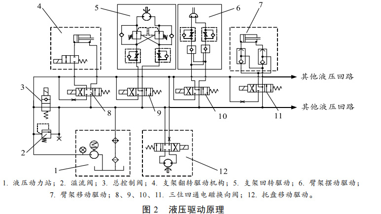 超高壓水射流破拆機器人機械臂架的液壓驅(qū)動原理圖如圖 2 所示。