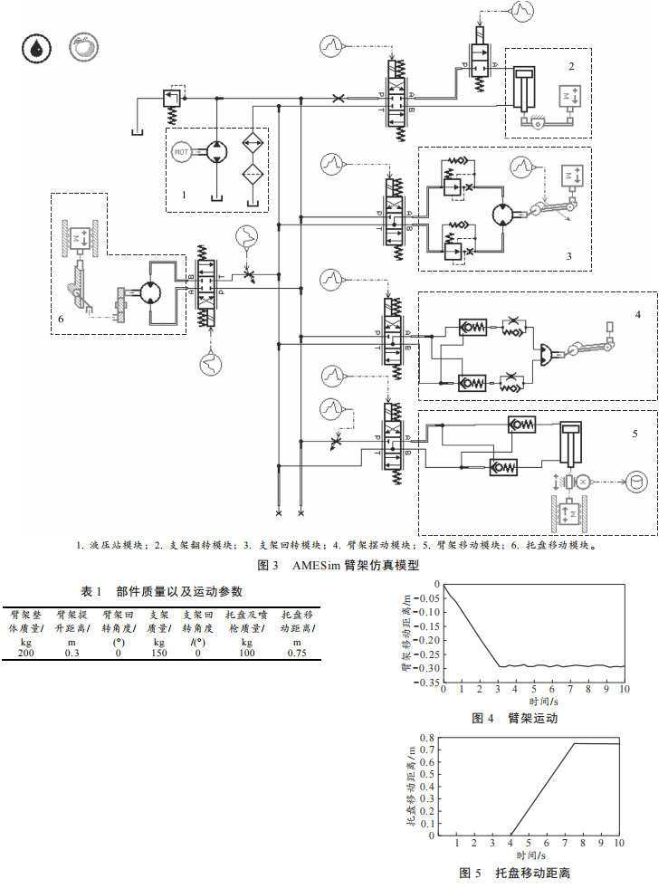 處于波動狀態(tài);根據(jù)圖 5,托盤移動閥開啟后,托盤在 3.5 s 內(nèi)運動了 0.75 m;根據(jù)圖 6,仿真開始時系