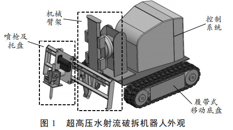 超高壓水射流破拆機器人由履帶式移動底盤、控制系統(tǒng)、機械臂架和噴槍及托盤4 部分組成[4]。其 3 維模型如圖 1 所示。