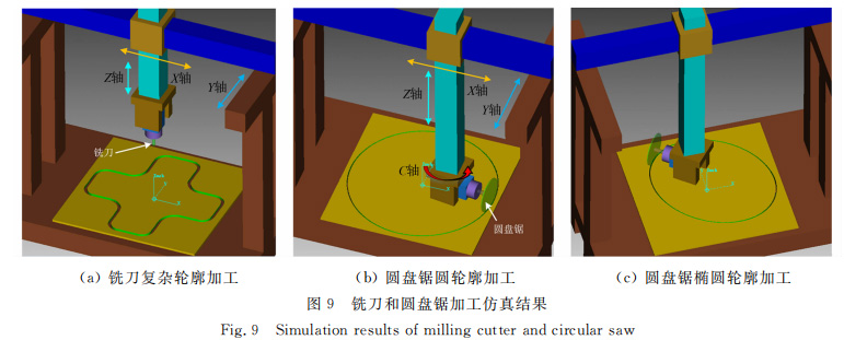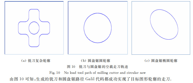 由仿真結(jié)果可知:利用生成的 G 代碼,銑刀和圓盤鋸都可以加工出目標(biāo)圖形輪廓;且圓盤鋸加工過程中,實(shí)現(xiàn)了C軸切向隨動(dòng),Δθ取更小的值可以滿足更高的的機(jī)床精度要求求。