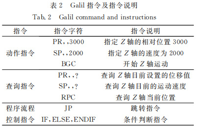 Galil代碼是 Galil運(yùn)動(dòng)控制卡使用的加工指令,指令從功能區(qū)分可以分為動(dòng)作指令、查詢指令和程序流程控制指令。部分指令及說明(Galil代碼中的A,B,C軸分別對應(yīng)于機(jī)床的X,Y,Z 軸),如表2所示。 對于銑刀刀具路徑,同樣將節(jié)2.2計(jì)算得到的點(diǎn)坐標(biāo)按照相應(yīng)的代碼(如 PA,PR,CR)格式重構(gòu)。對于圓盤鋸路徑,將偏置后的數(shù)據(jù)和C軸切向隨動(dòng)角度用相應(yīng)的代碼格式重構(gòu),再加上速度、加速度、延時(shí)等輔助功能指令,即