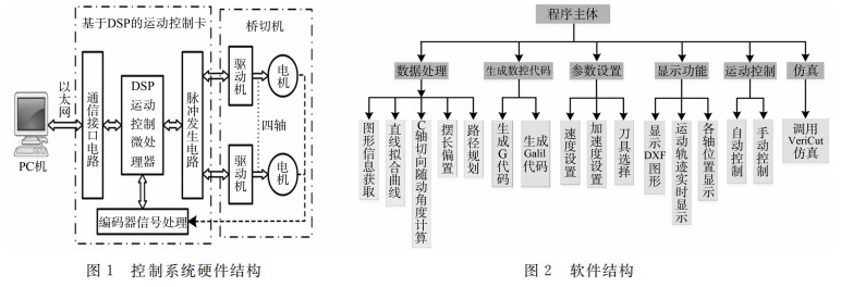 的多功能化、自動(dòng)化、數(shù)控化[3-6]。設(shè)計(jì)多功能、高效率、高自動(dòng)化、加工范圍廣的石材數(shù)控橋切機(jī),是石材加工行業(yè)發(fā)展的迫切要求[7-8]。國外已將傳統(tǒng)普通橋切機(jī)升級為多功能、數(shù)控橋切機(jī),實(shí)現(xiàn)圓鋸片在XY平面360°回轉(zhuǎn)和鋸片擺頭功能[9-10]。金成毅等[11]采用可編程邏輯控制器(PLC)控制系統(tǒng)實(shí)現(xiàn)了石材分片自動(dòng)切割,此系統(tǒng)只用三軸進(jìn)行直線切割,是目前國內(nèi)石材行業(yè)普遍采用的切割方式。劉玉梅[12]采用PC+RTX()+I/O 卡結(jié)構(gòu),使用 VC++ 開發(fā)三軸數(shù)控系統(tǒng),然而,該系統(tǒng)只用銑刀進(jìn)行簡單異型板材輪廓加工,加工范圍有限。文獻(xiàn)[13-14]采用 PC+運(yùn)動(dòng)控制卡結(jié)構(gòu),使用 VC++ 開發(fā)四軸數(shù)控系統(tǒng),但這些討論只針對圓弧輪廓。針對上述問題,本文設(shè)計(jì)了石材橋切機(jī)控制系統(tǒng),使用直線擬合法[15-17]以加工小線段的形式進(jìn)行曲線輪廓加工;同時(shí),使用 C#語言編程,生成刀路 G 代碼用于 VeriCut軟件進(jìn)行機(jī)床仿真,生成 Galil代碼用于下載到運(yùn)動(dòng)控制卡進(jìn)行機(jī)床走刀。