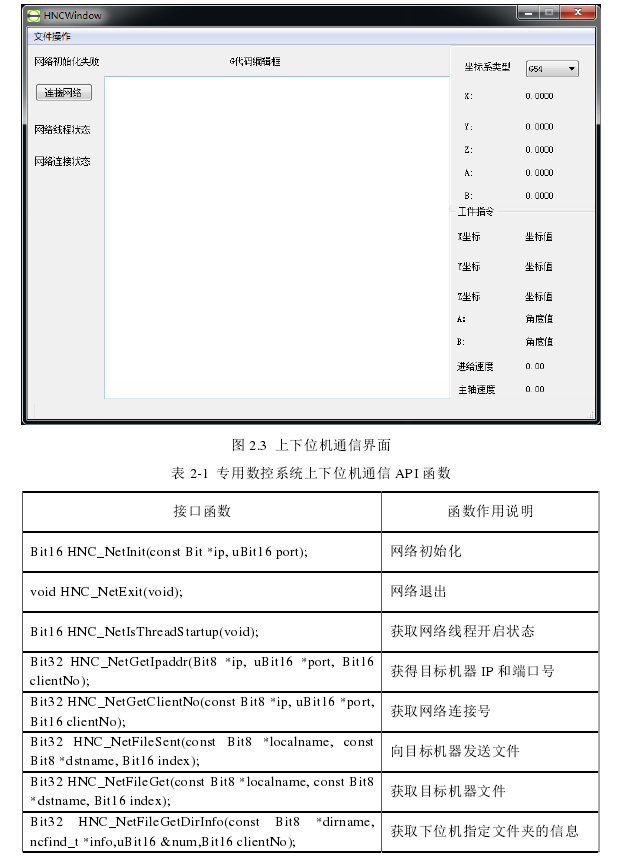 本文研究的 CAD/CAM 一體化的五軸聯(lián)動水刀切割專用數(shù)控是上下位機的系統(tǒng)構(gòu)成,上位機是在 Windows 平臺上利用 Qt Creator 開發(fā)的 CAD/CAM 一體化軟件,下位機是華中 8 型數(shù)控系統(tǒng)。針對五軸水刀切割特殊加工工藝和控制要求開發(fā)了專用數(shù)控系統(tǒng)。其中上位機與下位機的通信主要是通過華中 8 型數(shù)控系統(tǒng)提供了一個以太網(wǎng)口(通過網(wǎng)線連接)進(jìn)行網(wǎng)絡(luò)連接來獲取下位機信息,及將上位機有關(guān)信息傳送到下位機,如將上位機軟件生成的五軸數(shù)控 G 代碼發(fā)送給下位機。擬開發(fā)的 CAD/CAM 一體的五軸聯(lián)動水刀切割專用數(shù)控系統(tǒng)上下位機通信的界面如圖 2.3 所示,專用數(shù)控系統(tǒng)二次開發(fā)通信的 API(Application Programming Interface)函數(shù)主要如表 2-1 所示。CAD/CAM 一體化上位機可以利用華中 8 型二次開發(fā)接口函數(shù)與華中 8 型數(shù)控系統(tǒng)下位機建立連接,并進(jìn)行數(shù)據(jù)之間的交換。