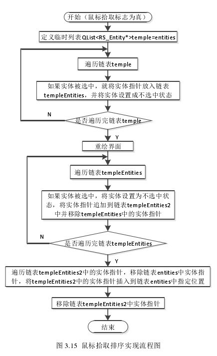 temple Entities 是否為空),若是,就遍歷鏈表 temple Entities2 中實(shí)體指針,移除鏈表 entities 中的實(shí)體指針并將鏈表 temple Entities2 中實(shí)體指針插入到鏈表entities 中。整個鼠標(biāo)拾取排序操作的流程圖如圖 3.12 所示,鼠標(biāo)拾取排序前后的效果圖分別如圖 3.13 和圖 3.14 所示,代碼實(shí)現(xiàn)的流程圖如圖 3.15 所示。