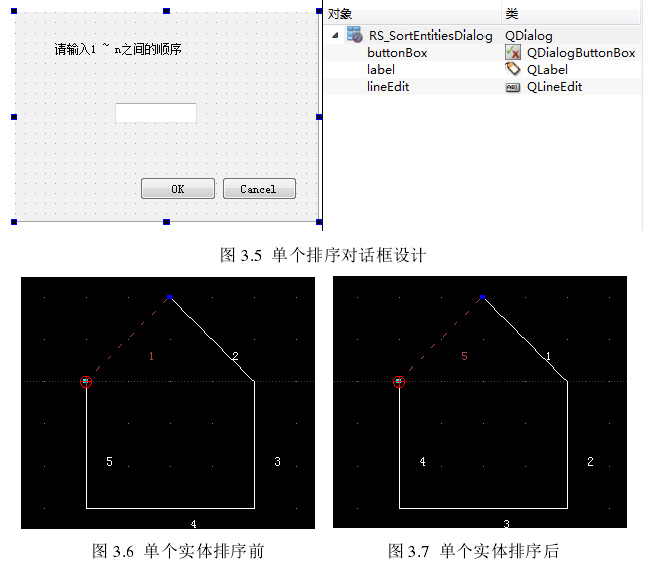 ,鼠標(biāo)拾取排序按鈕被激活。具體每一個實(shí)體對應(yīng)的一個序號的實(shí)現(xiàn)函數(shù)都是drawTextp(intx1, inty1, const QString& text),只是對于不同種類實(shí)體調(diào)用的參數(shù)不同而已 , 例如直線: drawTextp(midPoint.x+20,midPoint.y+20,QString::number(painter->m_n Indx)),其中調(diào)用的實(shí)際參數(shù)是直線段中點(diǎn) x 坐標(biāo)+20、y 坐標(biāo)+20、實(shí)體在容器中的序號。具體手動排序方式界面設(shè)計(jì)與實(shí)現(xiàn)將在下面每一小節(jié)中進(jìn)行具體的介紹。
