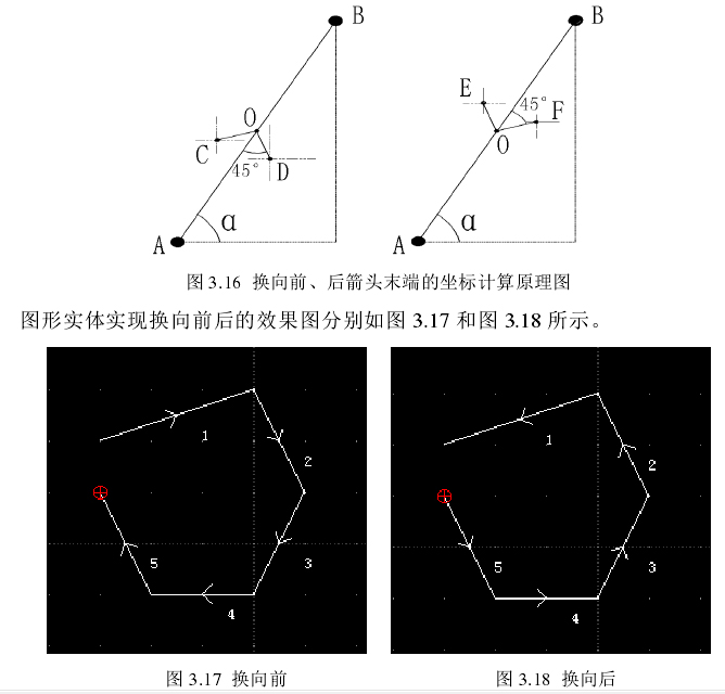 對于每一個實體(直線,圓弧,圓,橢圓,polyline,polygon,spline 等),在自定義創(chuàng)建圖形實體時或是從二維圖形文件(CAD 保存的.dxf 文件)中讀取圖形實體時,實體方向是任意的,此時,用戶可以根據(jù)自己的需要修改實體的加工方向。選中實體,可修改其加工方向(即切割的進給方向)。如可以將圖形實體繪圖終點作為加工起點,由繪圖終點運動到繪圖起點。對于不是封閉的圖形如直線、圓弧,圖形實體換向主要是將起點與終點互換,而對于封閉的圖形,如圓、橢圓及 polyline 等,圖形實體換向主要是定義一個標(biāo)志換向的變量,然后再在具體畫箭頭的函數(shù)中來實現(xiàn)箭頭的換向。在這里,具體說明直線換向和箭頭實現(xiàn)的過程。
