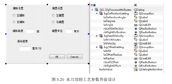 并且通過函數(shù) set Water Cut Process Data(RS_Water Cut Process Data const &data)來設(shè)置水刀切割數(shù)據(jù),通過函數(shù) get Water Cut Process Data()來得到水切割數(shù)據(jù)。水刀切割工藝參數(shù)設(shè)計界面及用到的 Qt 組件如圖 3.20 所示。